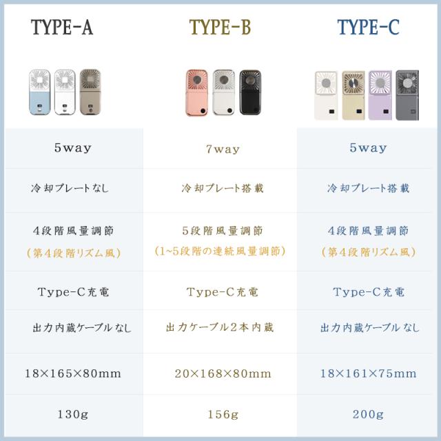 ※TYPE-AとCタイプの風量調節は、1〜3段階が徐々に強くなる「連続風モード」、4段階目が強弱を繰り返す「リズム風モード」という仕様です。Bタイプは1〜5段階すべてが連続風モードとなっております。