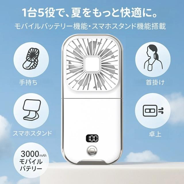 従来の携帯扇風機とは一線を画す多機能性!「暑い・重い・充電切れ」という夏の悩みをすべて解決します。電車通勤、オフィス、アウトドア、スポーツ観戦、お祭り、花火大会など、あらゆる場面で活躍します。