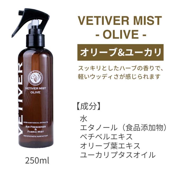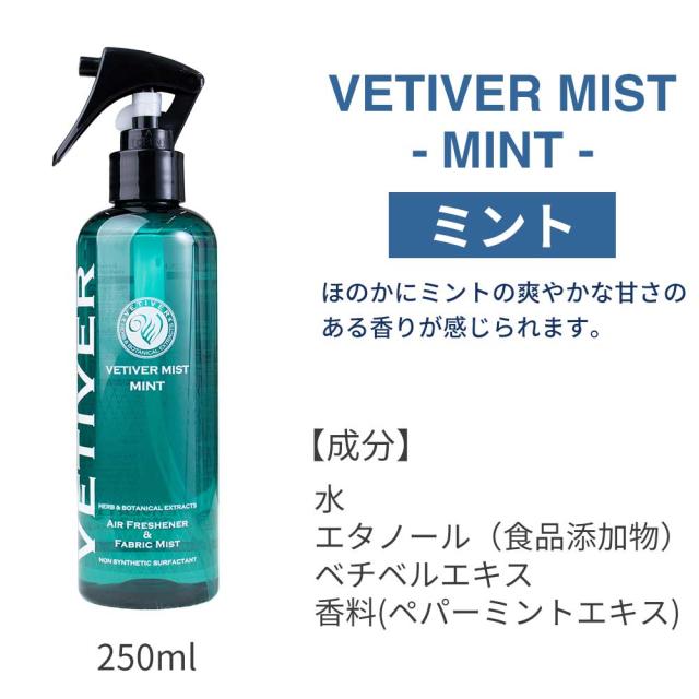 《ベチベルミスト》水、エタノール(食品添加物)、ベチベルエキス《ベチベルミスト(オリーブ)》水、エタノール(食品添加物)、ベチベルエキス、オリーブ葉エキス、ユーカリプタスオイル《ベチベルミスト(ミント)》水、エタノール(食品添加物)、ベチベルエキス、香料(ペパーミントオイル)