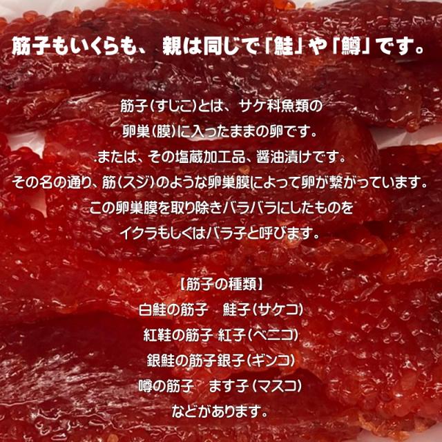 原材料:べにさけすじこ(アメリカ合衆国産)、食塩、粉末水飴/調味料(アミノ酸等)、酸化防止剤(V.C)発色剤(亜硝酸Na)