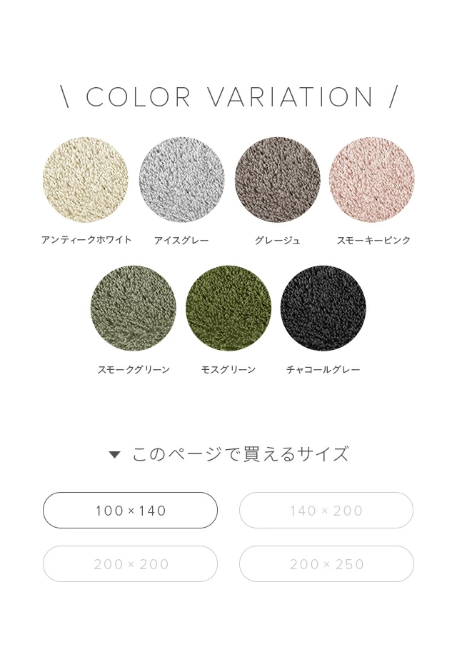 アイスグレー、アンティークホワイト、グレージュ、チャコールグレー、モスグリーン、スモークグリーン、スモーキーピンク