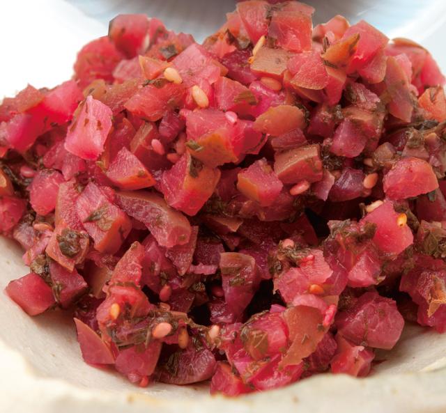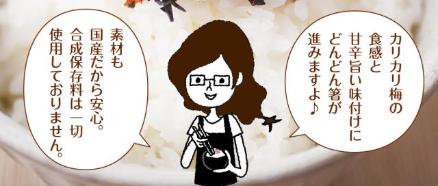 調味梅漬(梅(国産)、漬け原材料(食塩、果糖ぶどう糖液糖、醸造酢、しそ梅酢、酵母エキス))(国内製造)、ひじき、砂糖、食塩、ごま、発酵調味料、たん白加水分解物、ホタテエキス、昆布粉末、香辛料/酒精、酸味料、調味料(アミノ酸等)、香料、ビタミンB1、着色料(赤102)、(一部にごまを含む)