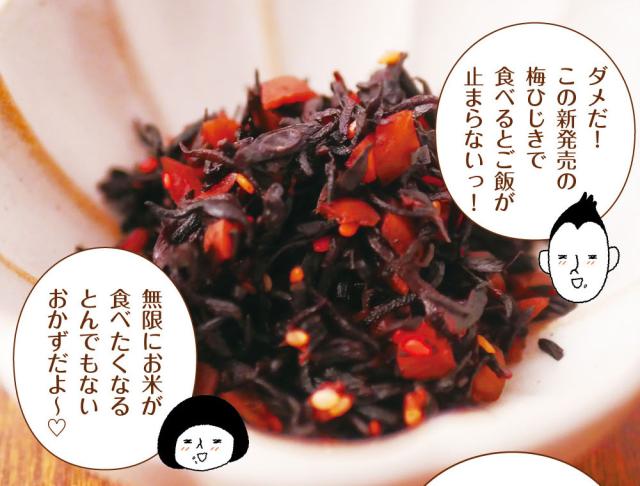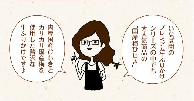 調味梅漬(梅(国産)、漬け原材料(食塩、果糖ぶどう糖液糖、醸造酢、しそ梅酢、酵母エキス))(国内製造)、ひじき、砂糖、食塩、ごま、発酵調味料、たん白加水分解物、ホタテエキス、昆布粉末、香辛料/酒精、酸味料、調味料(アミノ酸等)、香料、ビタミンB1、着色料(赤102)、(一部にごまを含む)
