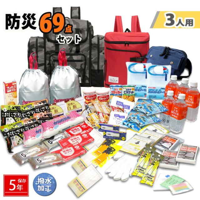 3人分 家族用 310 307 防災セット サブリュック 防災グッズ 非常用持出袋 防災リュック 69点セット リーベン ボストンバッグ 3人用 災害対策 防災用品 凝固剤不要トイレ 避難グッズ 地震対策 水害 家族 避難用品 7年保存水 非常食 防災 レインコート