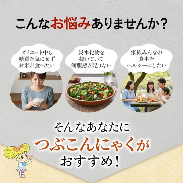 | つぶこんにゃく(こんにゃく米)は、白米と一緒に炊くだけで糖質もカロリーも手軽にカットできる、ヘルシー志向の新定番。見た目はまるでお米のような粒状タイプで、炊き上がりもふっくら。白米に混ぜても違和感が少なく、しっかり“お米の食べごたえ”を楽しめます。普段のご飯を置き換えたり、かさ増ししたり、ダイエット中の方や糖質を控えたい方にもおすすめ。カロリー・糖質ゼロなのに満足感はそのまま。毎日の食卓に手軽に取り入れられます。 |