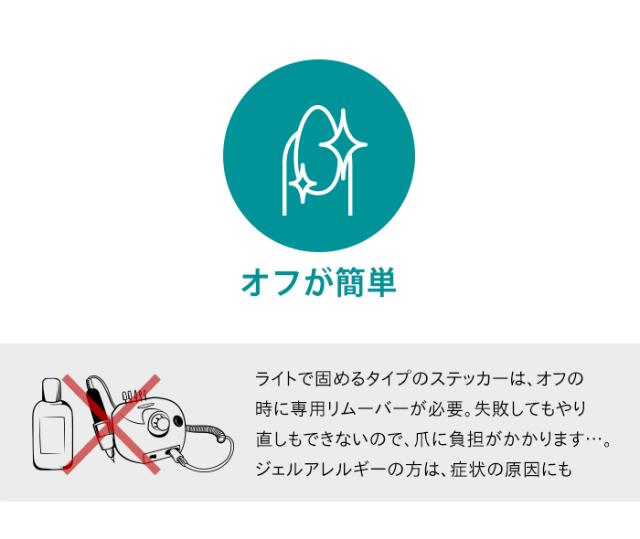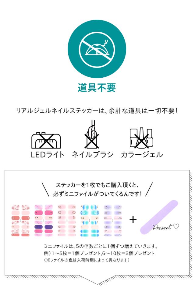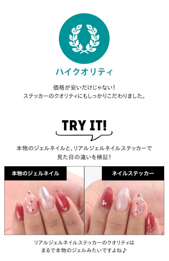 | 商品説明 | まるで本物のジェルネイル?! 貼るだけ簡単着せ替えネイル♪リアルジェルネイルステッカー 豊富なデザインバリエーションの中から気分に合わせてネイルチェンジ とにかく時短!忙しいママや週末ネイルにもピッタリ お仕事上ネイルができない方でも、週末だけのネイルが楽しめます♪ 貼るだけで完結するシンプルな工程で時間をかけずにサクッとネイルチェンジでき オフする際はぺりっと剥がすだけ♪ シールなら貼り替えるだけなので自爪への負担もほどんどありません! |