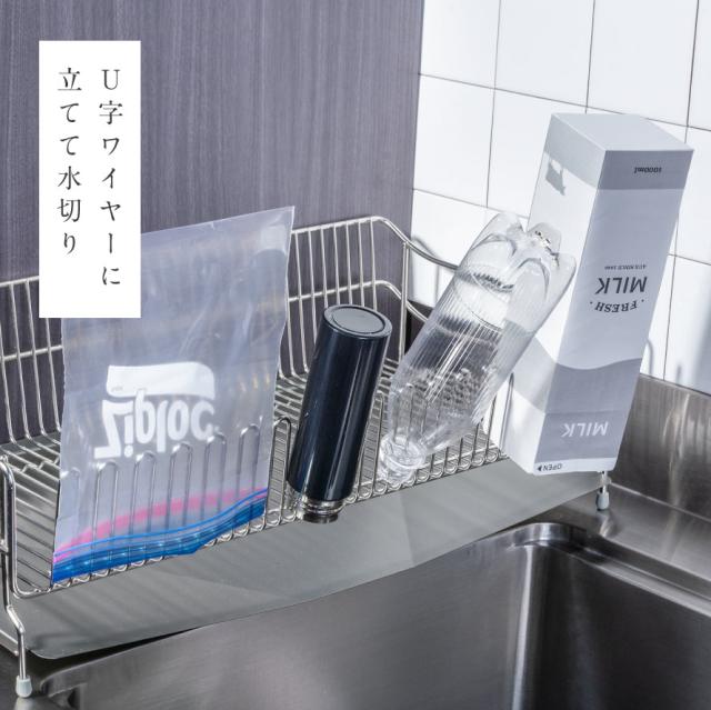 また、U字ワイヤーに、グラスや水筒、ペットボトルやフリーザーバッグなどを立てて水切りができます。