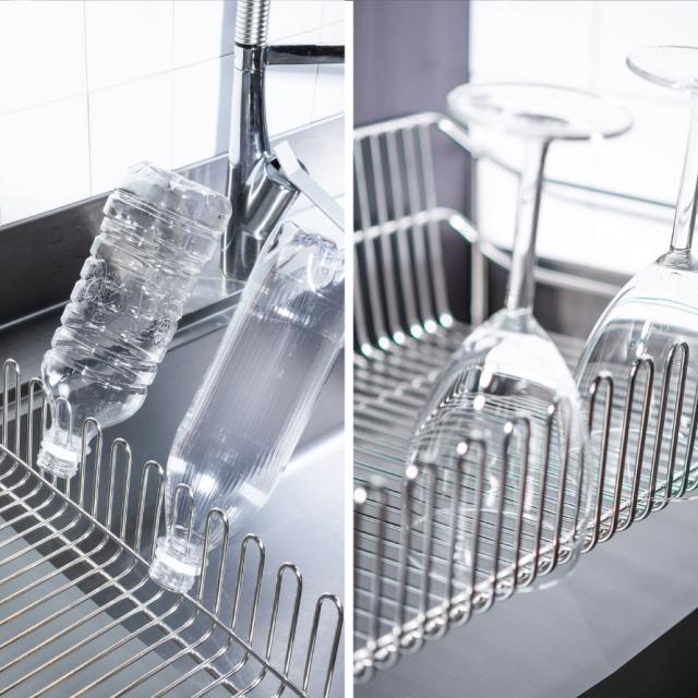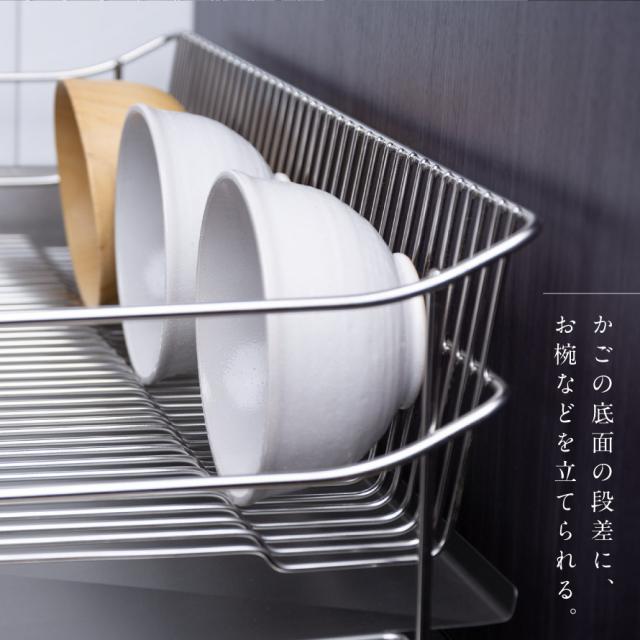 かごの底面の段差に、お椀などを立てられるので、お椀の底に水を残さず水切りできます。