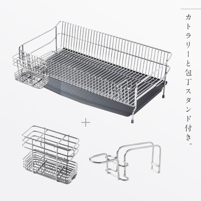 燕三条 水切りラック 全長56m 30cm / 幅29.5cm 高さ18.4cm 水切りかご 水切りラック ステンレス スリム シンク上 シンク横 箸立て 包丁スタンド 付き ステンレス製 大容量 コンパクト シンク かご カゴ 水切りトレー 水切りトレイ トレー 縦置き 水が流れる シンクに渡せる