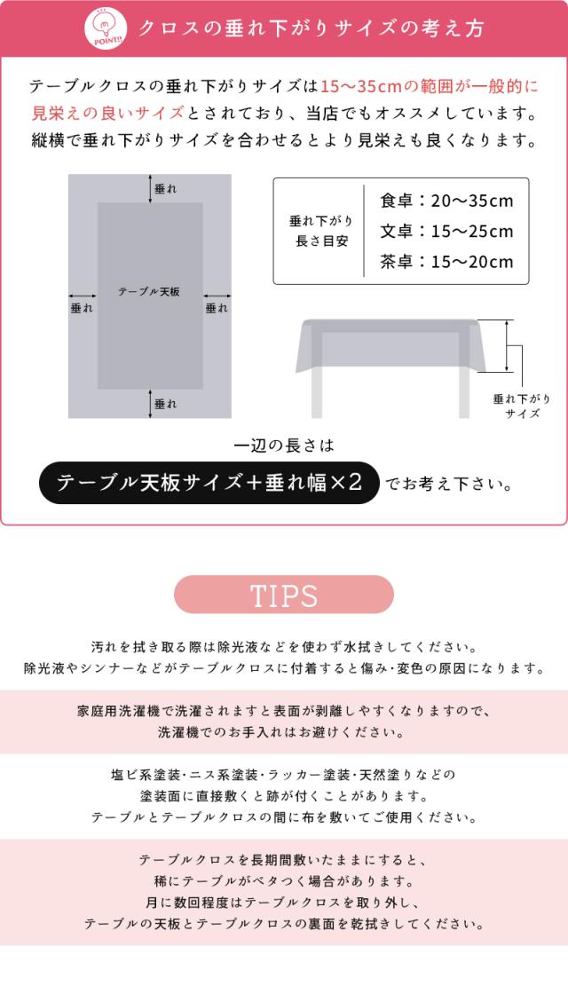 | 注意事項 | ●汚れが付着した時は、すぐに拭き取るようにしてください。 長時間放置すると染みになることがあります。 ●長期間使用されない場合、柄移り、柄がはがれてくることがありますのでご注意ください。 ●本製品は、お客様に少しでもお安くお買い求めいただけるよう、 ポスト投函できるサイズに折り畳んで発送させていただきます。 その為、折りシワがついてしまいますので、予めご了承ください。 ●汚れを拭き取る際には、ベンジンや除光液等は使用せず、水拭きしてください。 ※汚れがひどく、水拭きで取り除けない場合は、中性洗剤を溶かしたぬるま湯で拭き取ってください。そのあと、洗剤が残らないように完全に拭き取りましょう。 ●マニュキュアの除光液やシンナーがテーブルクロスに付着すると、 表面が傷む可能性がありますので使用しないでください。 ●塩ビ系塗装、ニス系塗装、ラッカー塗料、天然塗りのものなとの塗装面に直接敷くと型が付くことがあります。該当品に使用する場合は、必ず布を間に敷いてください。 ●テーブルクロスを長期間敷いたままにすると、テーブルが稀にベタベタとしてしまう場合があります。10日に1回程度は取り外して、テーブルとクロスの裏側の乾拭きしてください。 ●火気のそばや高温多湿な場所、直射日光の当たる場所には保管しないでください。 ●本来の目的以外でのご使用はおやめください。 |