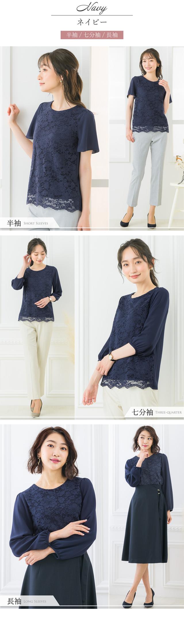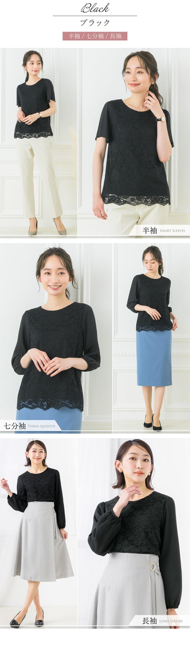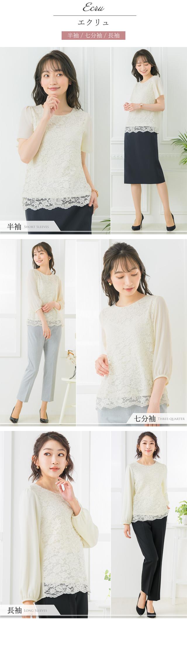 | 前身頃(フロント)のレース使いが華やかな印象のブラウス。 袖の長さを「半袖」「七分袖」「長袖」の3種類からお選びいただけます。 半袖はエアリーで軽やかなフレア袖のため見た目も涼やかで暑い季節にピッタリ。 七分袖は年間通して着用しやすい適度な長さで、季節の変わり目にも重宝します。 長袖は袖にも裏地がついているため防寒や透け防止としても活躍すること間違いなし。 インでもアウトでも可愛く着こなせ、コーディネートの幅が広がります。 スカラップ仕立てになっている裾もポイント。 一枚での着用はもちろん、ジャケットやスーツと合わせても全体の雰囲気をエレガントに仕上げてくれる、万能ブラウスです。 フロント全面にレースを使用しているため、オンラインミーティングやテレワークにもおすすめ! オフィスインナーの他にも、デイリーウェア、入学式や卒業式などのフォーマルインナーとしても幅広くご着用いただけます。 また、生地は軽くてサラリとしたジョーゼット生地を使用。 様々なシーンで活躍する主役級のアイテムです。 | |