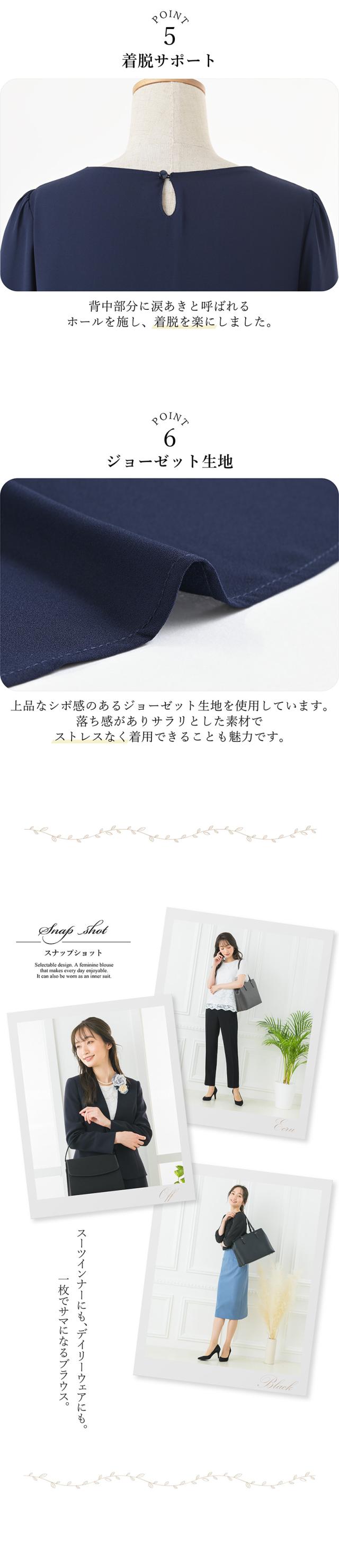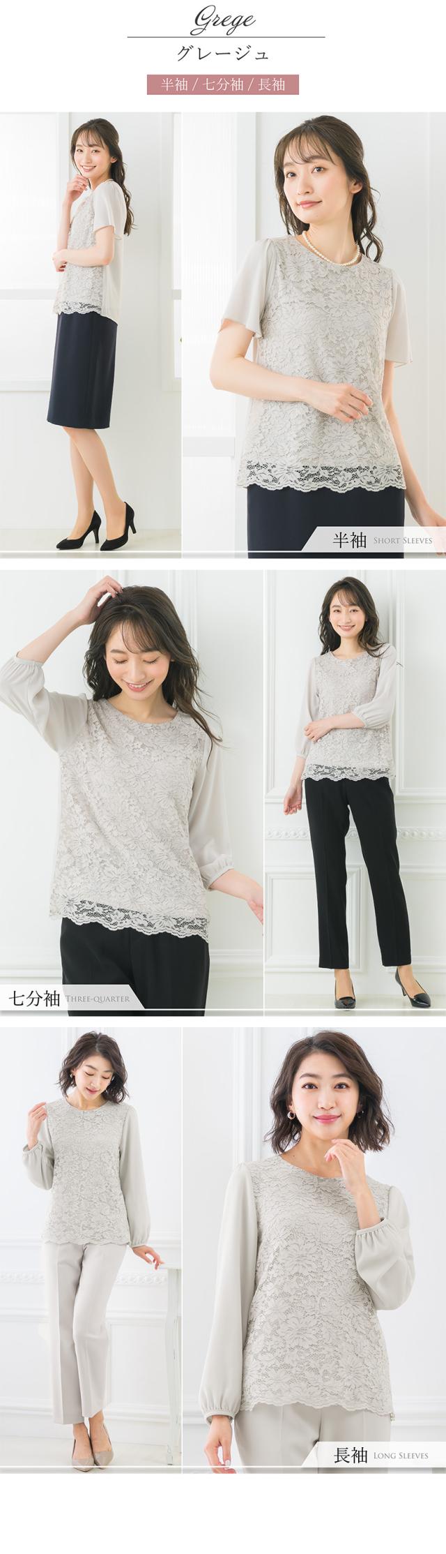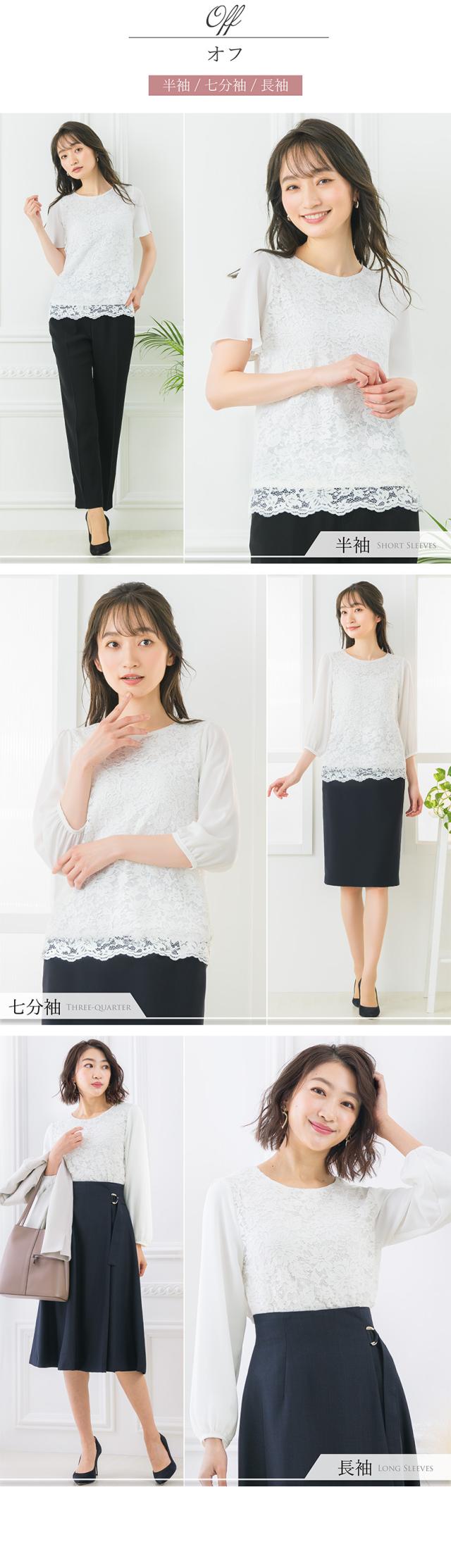 | 前身頃(フロント)のレース使いが華やかな印象のブラウス。 袖の長さを「半袖」「七分袖」「長袖」の3種類からお選びいただけます。 半袖はエアリーで軽やかなフレア袖のため見た目も涼やかで暑い季節にピッタリ。 七分袖は年間通して着用しやすい適度な長さで、季節の変わり目にも重宝します。 長袖は袖にも裏地がついているため防寒や透け防止としても活躍すること間違いなし。 インでもアウトでも可愛く着こなせ、コーディネートの幅が広がります。 スカラップ仕立てになっている裾もポイント。 一枚での着用はもちろん、ジャケットやスーツと合わせても全体の雰囲気をエレガントに仕上げてくれる、万能ブラウスです。 フロント全面にレースを使用しているため、オンラインミーティングやテレワークにもおすすめ! オフィスインナーの他にも、デイリーウェア、入学式や卒業式などのフォーマルインナーとしても幅広くご着用いただけます。 また、生地は軽くてサラリとしたジョーゼット生地を使用。 様々なシーンで活躍する主役級のアイテムです。 | |