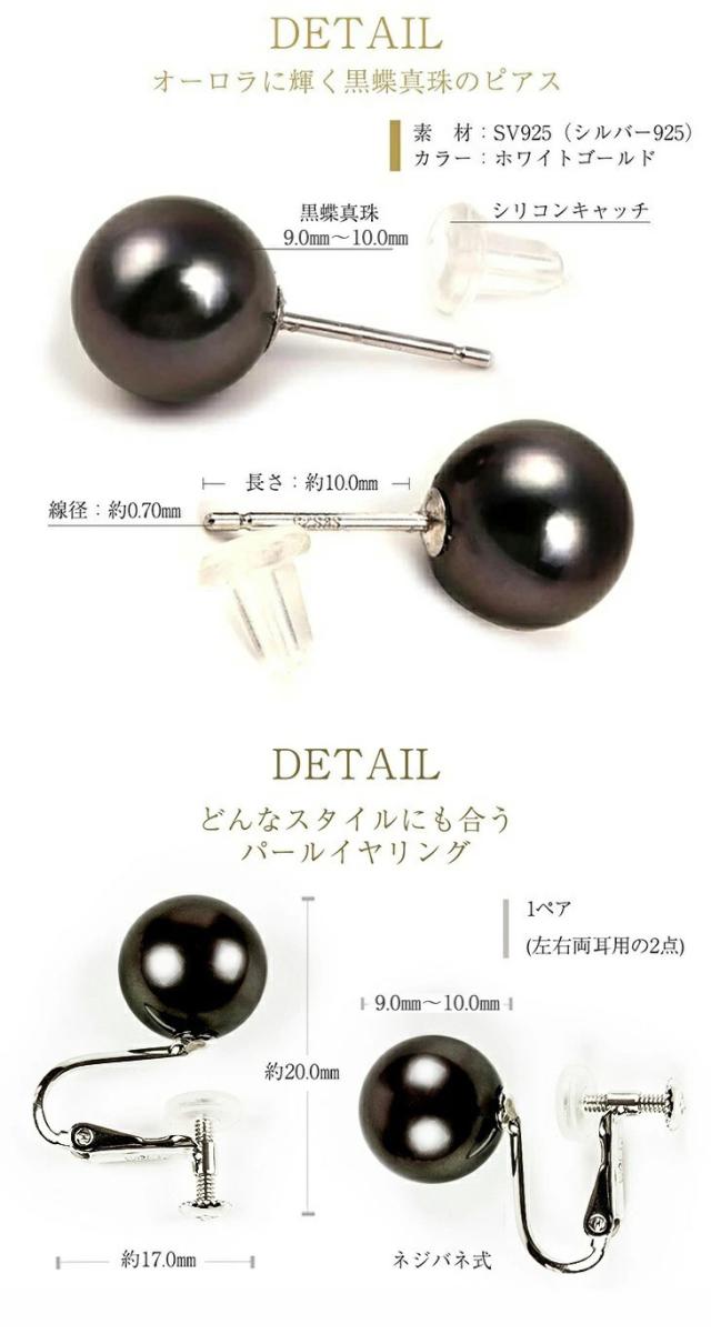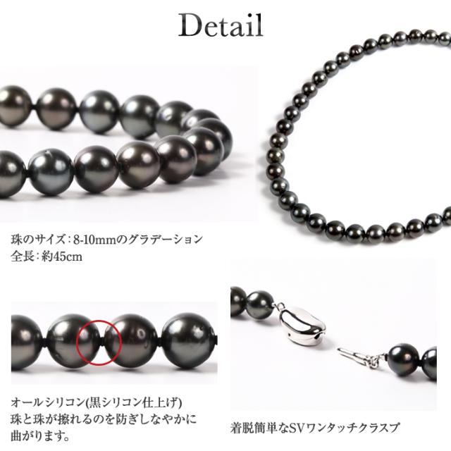 【素材・商品サイズ】●ネックレス 全長:45cm 珠の大きさ:9.0-11.0mmのグラデーション 珠と珠が擦れるのを防ぎしなやかに曲がるオールシリコン(黒シリコン)仕上げ。 素材:黒蝶真珠 留め具:SV925 着脱かんたんなワンタッチクラスプ●イヤリング 全長:約20.0mm×約17.0mm 珠の大きさ:9.0-10.0mm 素材:黒蝶真珠 留め具:K14WG(14金ホワイトゴールド)