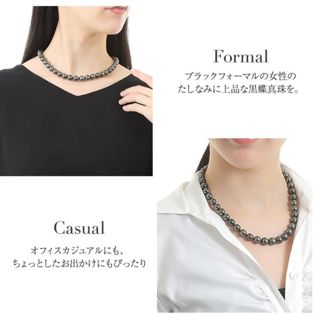 【オーロラに輝く黒蝶真珠ネックレス】珠の芯から湧き出るような深みがありオーロラに輝く黒蝶貝パール。神秘的な色彩とクリスタルな輝きをお楽しみ頂けます。ブラックフォーマルからオフィスカジュアル、ちょっとしたお出掛けにも使える大人女性の嗜みジュエリーです。