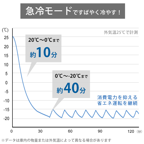 コンプレッサー式のため、ペルチェ式と比べてパワーが強く、スピーディに冷蔵・冷凍が可能。