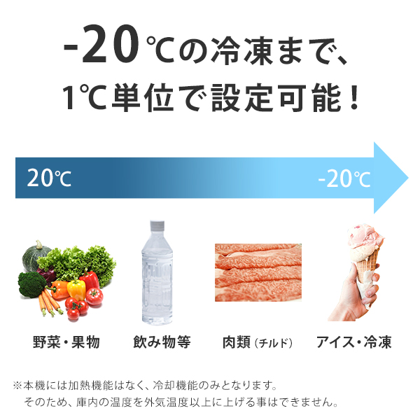 温度設定範囲は20℃〜-20℃で、1℃単位で設定できます。