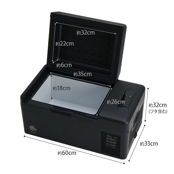 DC12 / 24V定格電流 5A / 2.5A 消費電力 45W USB出力 5V / 1A 容量 約20L 冷媒 R134a 感電保護クラス Ⅱ 使用環境温度範囲 -10〜35℃(±3〜5) 冷却方式 コンプレッサー式 設定可能温度 -20〜20℃ 断熱材 発泡ウレタン ACコード長さ 約2m(アダプター含む) DCコード長さ 約3.5m 外形寸法 約600×330×320mm 重量 約9kg 付属品 ACコード(家庭用100V)