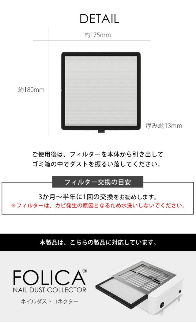 | 商品説明 | FOLICA(フォリカ)ネイルダストコレクターの専用取り替えフィルターです。 ダストコレクター使用後、フィルターを取り外し、ダストを振るい落としてください。 |