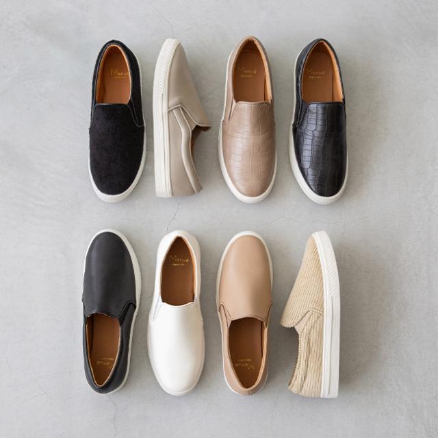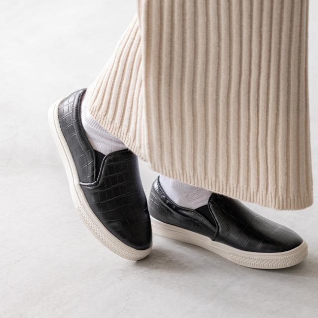 キャンバス生地でカジュアルなイメージが多いスリッポン。大人女子でも使いやすいように高見えする素材を使用することで、リラックス感と上品さを併せ持つ1足に仕上がりました。