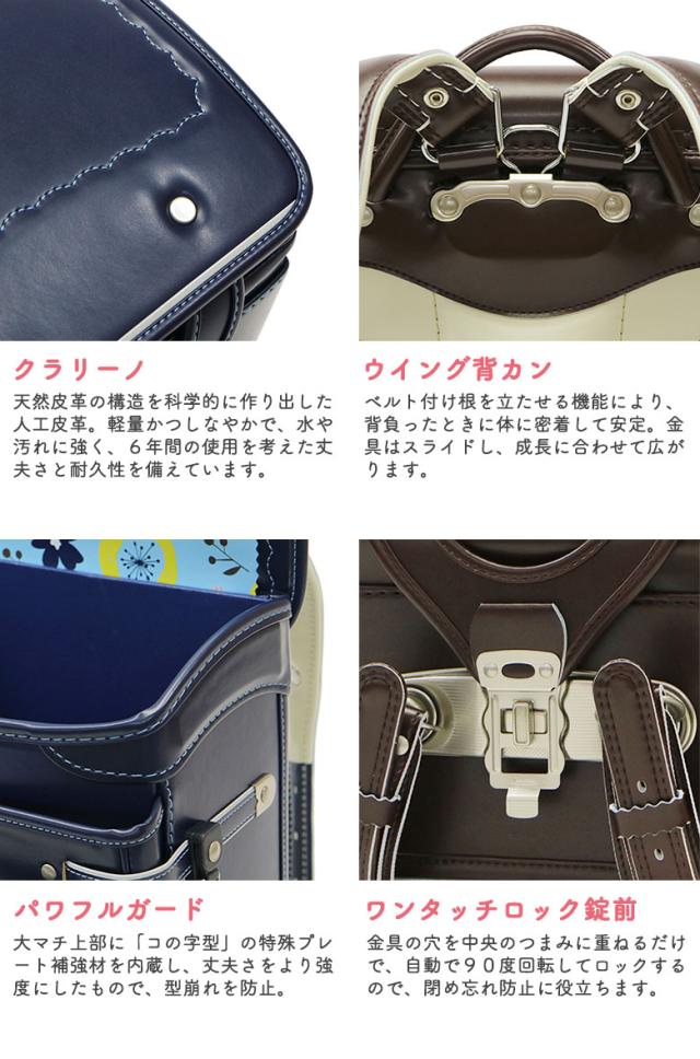 | 仕様 | 内側:ジップポケット(M)×1、ポケット(L)×1、ポケット(M)×1 付属品:ランドセルカバー、時間割表(ベーシック:1枚、オリジナルデザイン:6枚)、ネームカード(ベーシック:1枚、オリジナルデザイン:1枚)、連絡袋、メーカー保証書 |