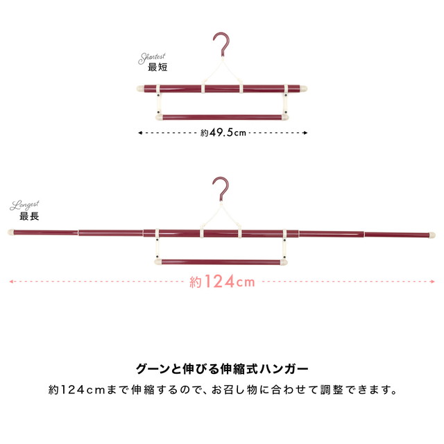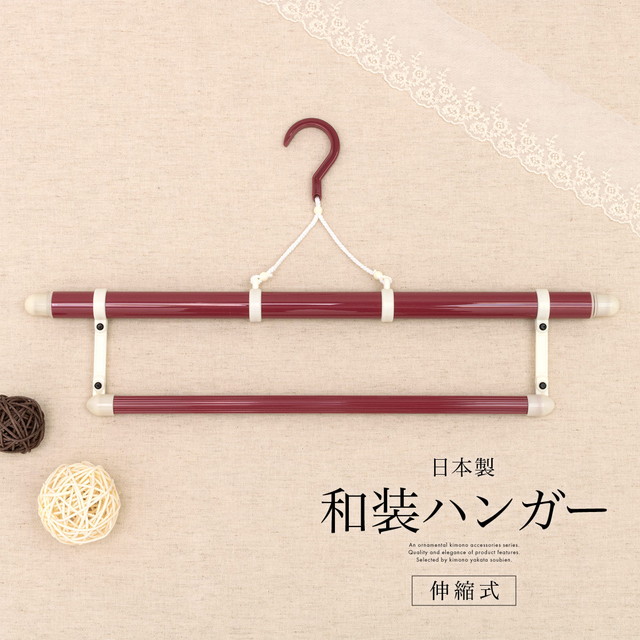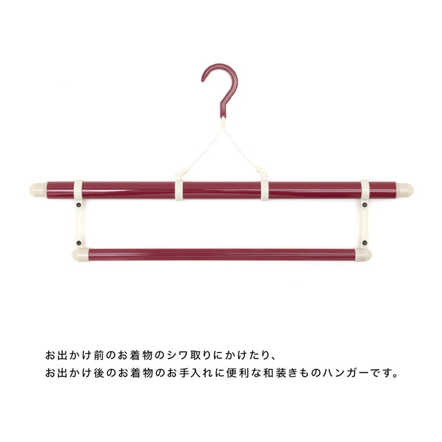 三段階で伸縮し、上段の長いハンガーには着物や襦袢を、下段の短いハンガーには帯や帯揚げ、帯締めなどの小物をかけておくことができます。