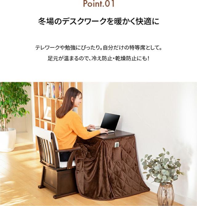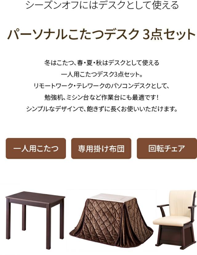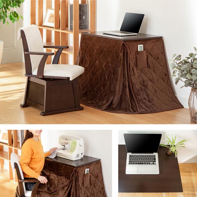 冬は「こたつ」、春・夏・秋は「デスク」として使えるハイタイプのデスク型こたつ3点セットです。こたつデスクと省スペースこたつ布団、さらに肘付き回転チェアが付いたフルセット。