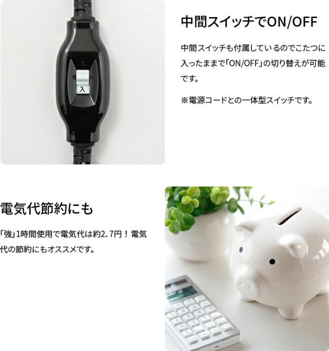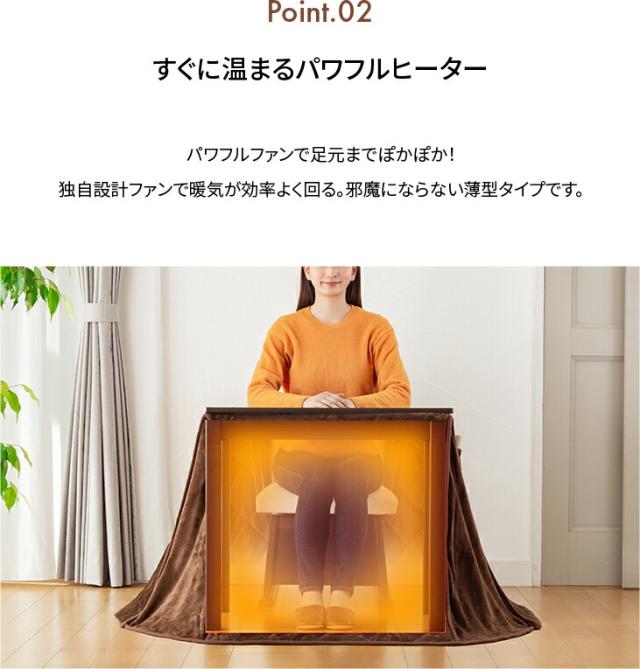 こたつ本体はすぐに温まるパワフルヒーターを搭載。独自設計のファンで暖気が効率よく回ります。さらに薄型ヒーターで膝上の邪魔になりません。