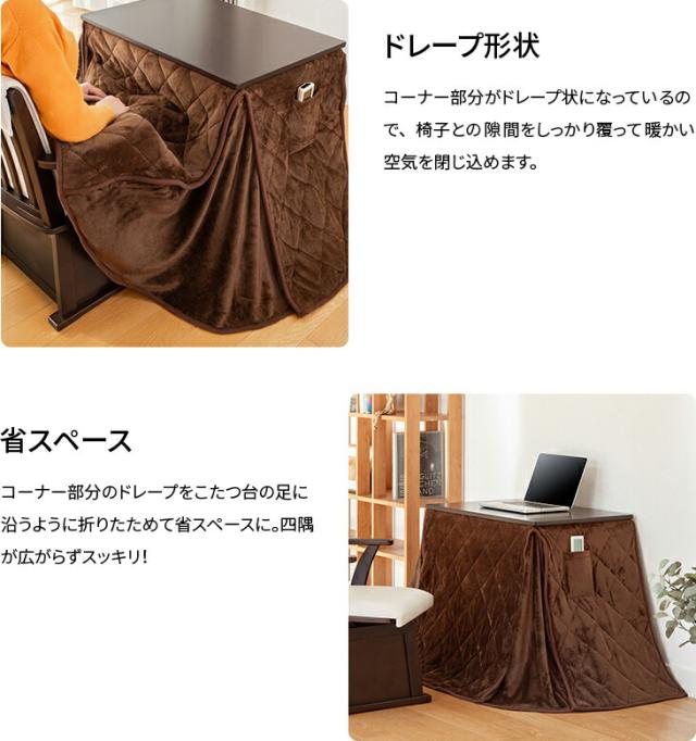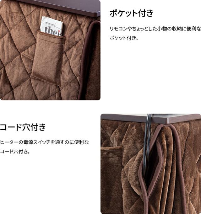両面肌触りの良いフランネル生地を使用した専用こたつ布団はコーナー部分にスリットが入っているため、布団が広がらず省スペースに使えます。リモコンが入るポケット付きでケーブルを通す穴もあいています。