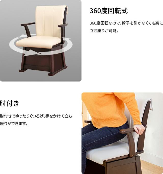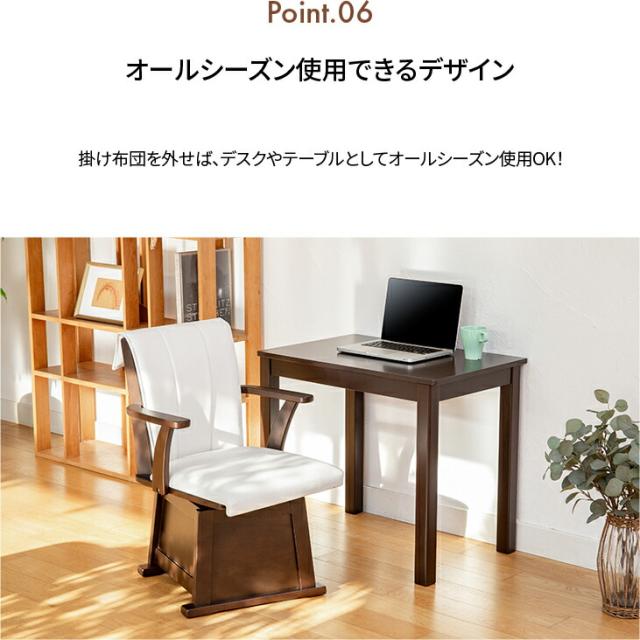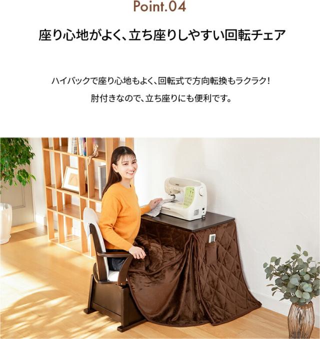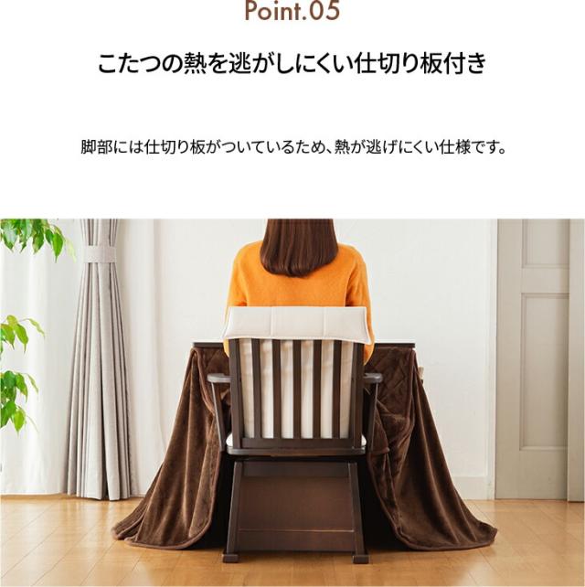 肘付き回転チェアは脚部に仕切り板が付いているため、こたつの熱が逃げにくい仕様です。ゆったりとした座り心地の大判座面で、座面が360度回転式なので、椅子を引かなくても楽に立ち座りができます。
