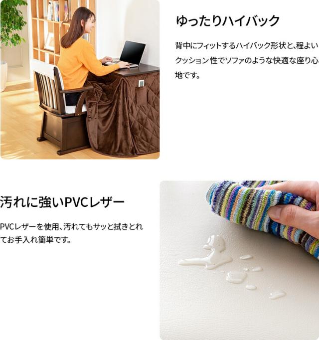 ●素材/椅子:天然木ラバーウッド材、座面:PVCウレタンフォーム、こたつ:天板:MDF転写・本体:ラバーウッド、布団:ポリエステル100%