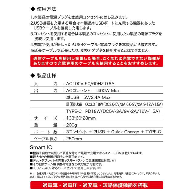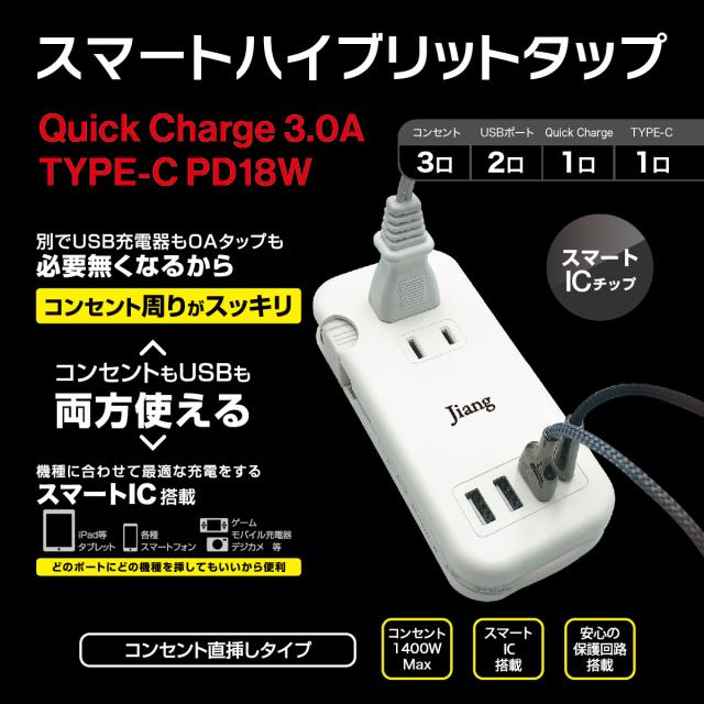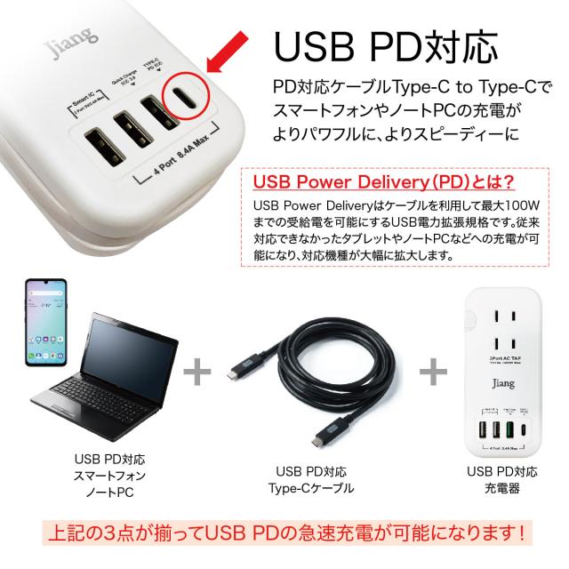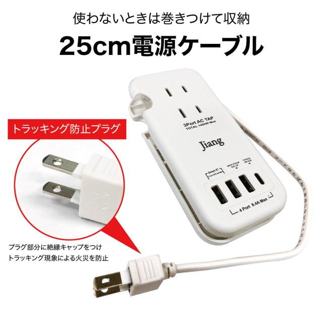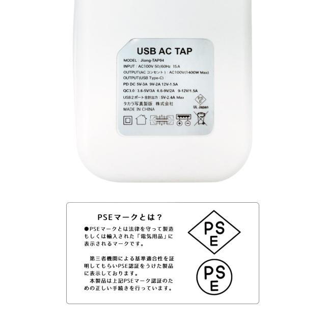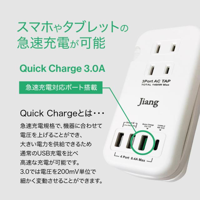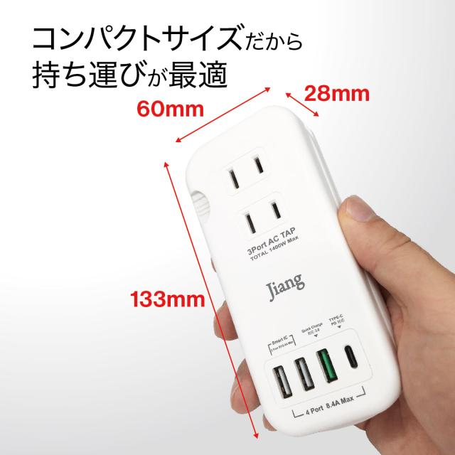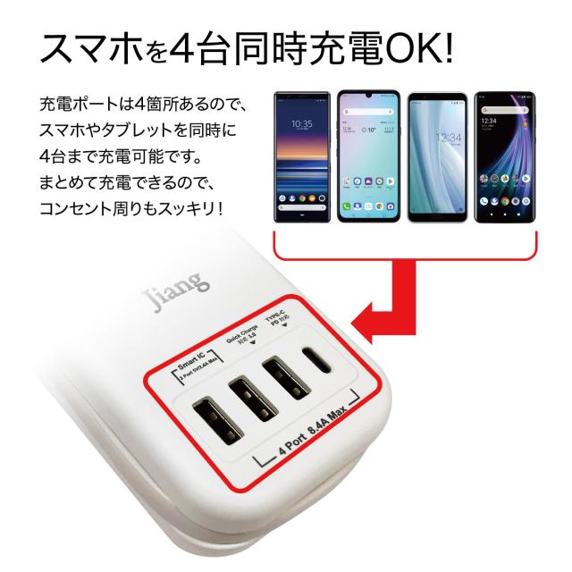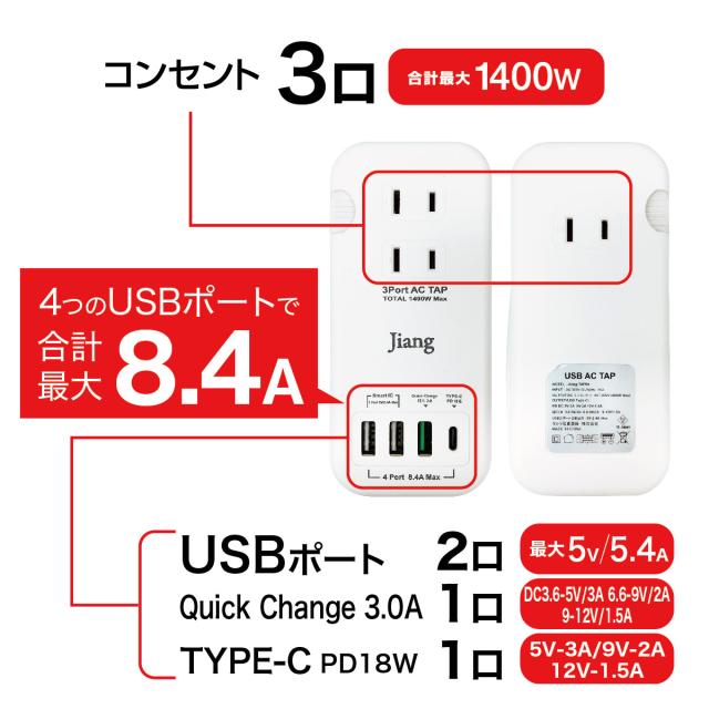 ACアダプター USB 12V 5a type c PD対応 急速充電 充電器 コンセント タップ 電源タップ 4ポート 4口 8.4A 充電器 USB充電器 コンセント 3口 1400W スマホ充電器 ノートパソコン Quick Charger 3.0A対応 jiang-tap04