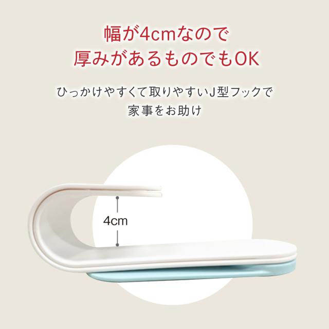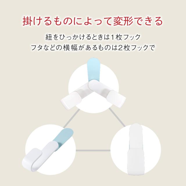 紐を引っかけるときは1枚フックで、ふたなどの幅があるものは2枚フックで使用。