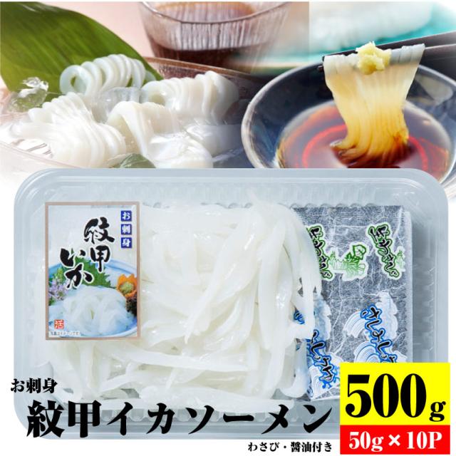 ○名称:いかそうめん○原材料名:●紋甲いか(インドネシア、ベトナム)、発酵調味料、食塩/ソルビトール、調味料(アミノ酸等)●添付しょうゆ:しょうゆ(小麦・大豆を含む)(国内製造)、水あめ、醸造酢、食塩、発酵調味料(小麦・大豆を含む)/カラメル色素、調味料(アミノ酸等)●添付わさび:本わさび(中国産)、西洋わさび、食物繊維、コーンフラワー植物油、砂糖、食塩/ph調整剤、香料、クチナシ色素、増粘多糖類○内容量:50g×10