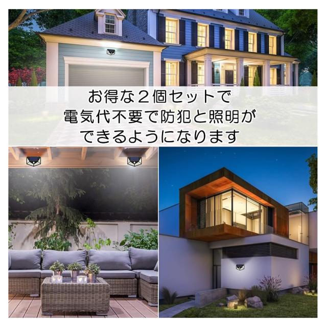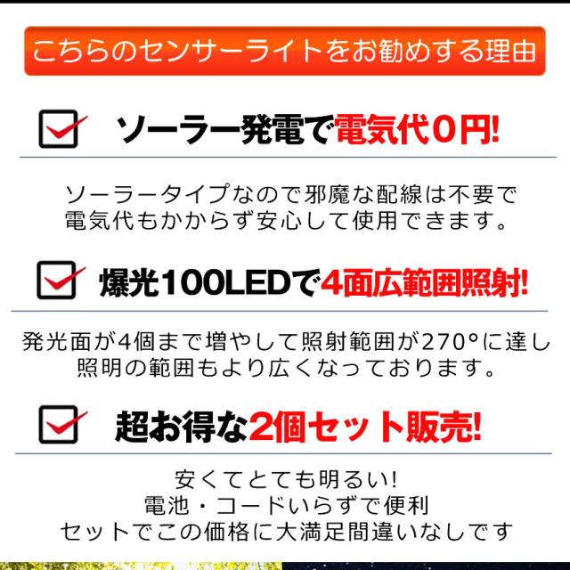 ランキング1位 ソーラーライト 屋外 防水 2個セット ソーラーセンサーライト センサーライト 人感センサーライト ガーデンライト 夜間 防犯ライト 防災ライト 100LED 高輝度 太陽光 電気代不要 屋外照明 照明 玄関 駐車場 庭 自動点灯 庭 2-YOMESENSAR