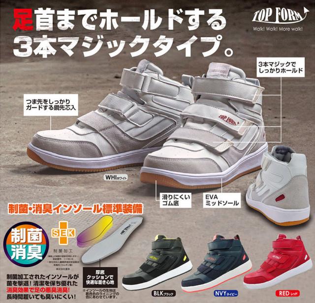足首までホールドする3本マジックタイプ。制菌・消臭インソール標準装備。つま先をしっかりガードする鋼先芯。滑りにくいゴム底。EVAミッドソール