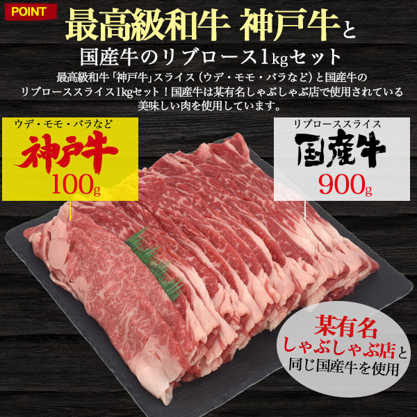 最高級和牛「神戸牛」スライス(ウデ・モモ・バラなど)と国産牛のリブローススライス1kgセット!