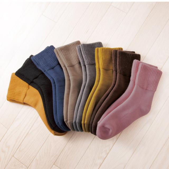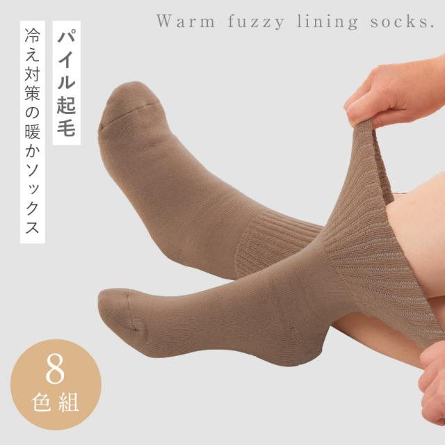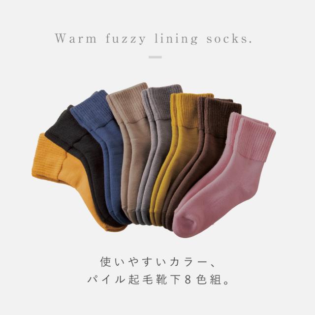 パイル起毛でふわもこ、カラー靴下8色組。肌面はふっくらとしたパイルに施したやわらかい起毛。綿のようにふんわり毛足が長く暖か。足を優しく包み込みます。