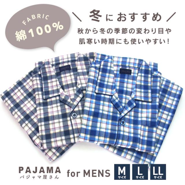 パジャマ メンズ 綿100% 長袖 冬 前開き ボタン ネル起毛 チェック柄 ブルー グレー M L LL 親子 おそろい リンクコーデ 家族 ギフト プレゼント 敬老の日 父の日 56171