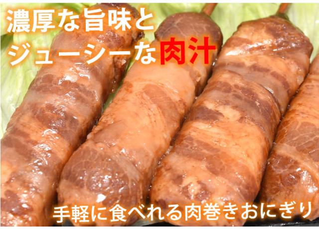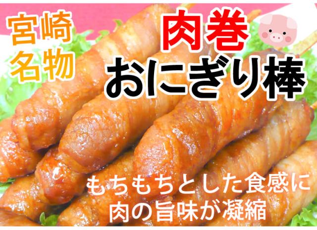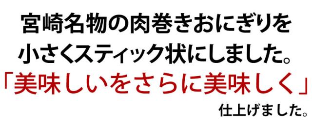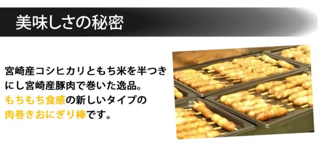 もちもちとした食感に肉の旨味が凝縮された、宮崎名物の肉巻きおにぎりを小さくスティック状にしました。串団子を食べる感覚で手軽に食べれる肉巻きおにぎりです。宮崎産コシヒカリ・宮崎産豚肉を使用しています。