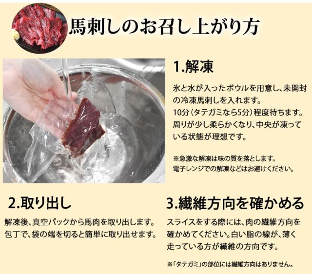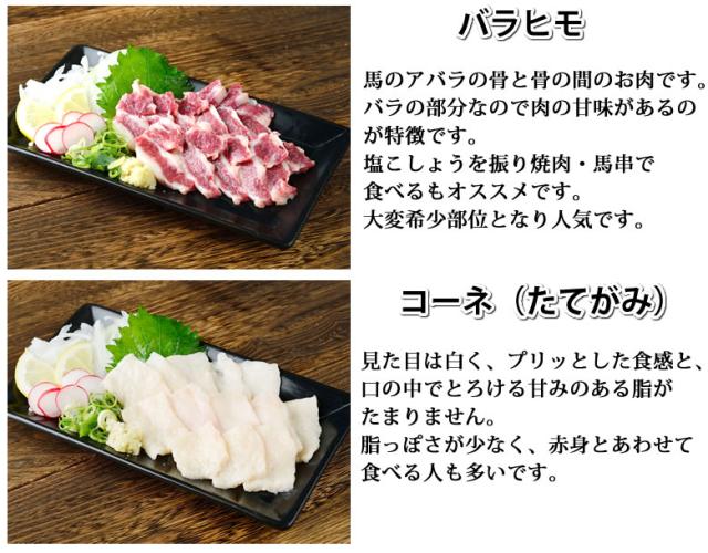 5人前 250g(赤身50g×1、霜降り50g×1、フタエゴ50g×1、バラヒモ50g×1、たてがみ50g×1) 馬刺しのたれ、しょうが付き