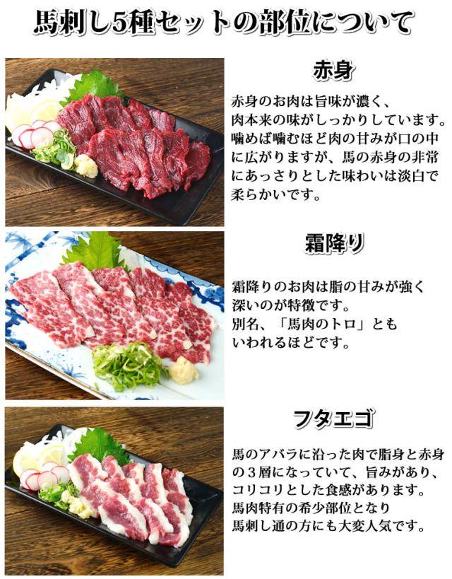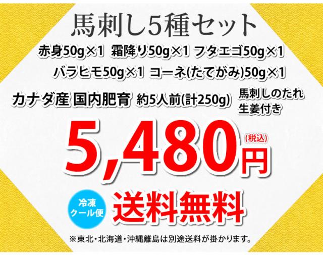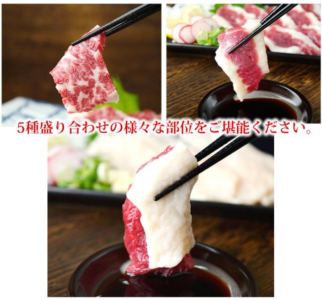 馬刺し 5種 盛り合わせセット 赤身 霜降り フタエゴ バラヒモ たてがみ 送料無料 5人前 250g カナダ産国内肥育 馬刺 熊本直送 ギフト 馬肉 お取り寄せ 肉