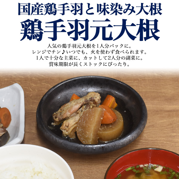 レンジ 惣菜 国産 鶏手羽元と味染み大根 【ストックおかず】常備菜 和食 和惣菜 煮物 鶏肉 大根 人参 レトルト食品 レンジでチン 夜食 防災 非常食 長期保存 常温保存 1人前 1人暮らし 温めるだけ 簡単調理 時短 電子レンジ 和風 調理済み お皿要らず そのまま食べられる