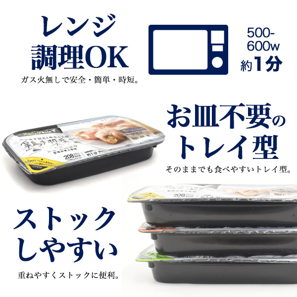 ガス火無しで安全・簡単・時短!レンジでチンでいつでも、火を使わず食べられます。 そのまま食べれるお皿不要のトレイ型!重ねやすく収納にも便利です。 賞味期限が長くストックにぴったりです。 | ||||||||||||||||||||||