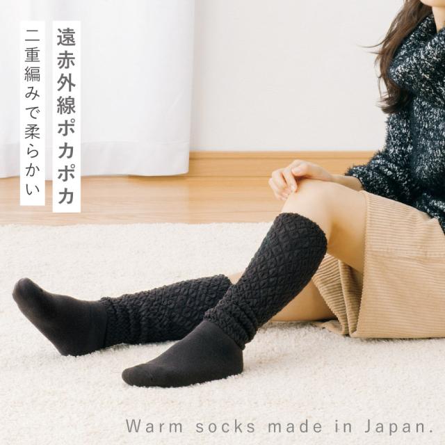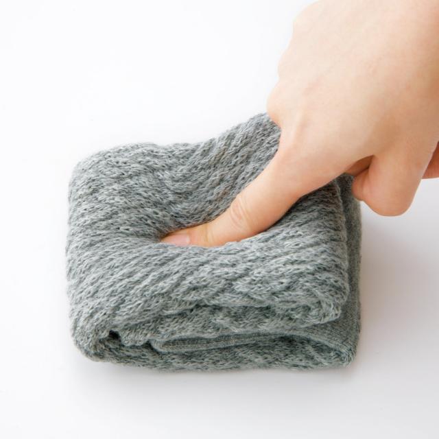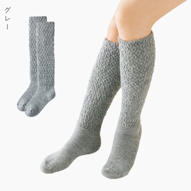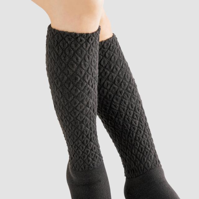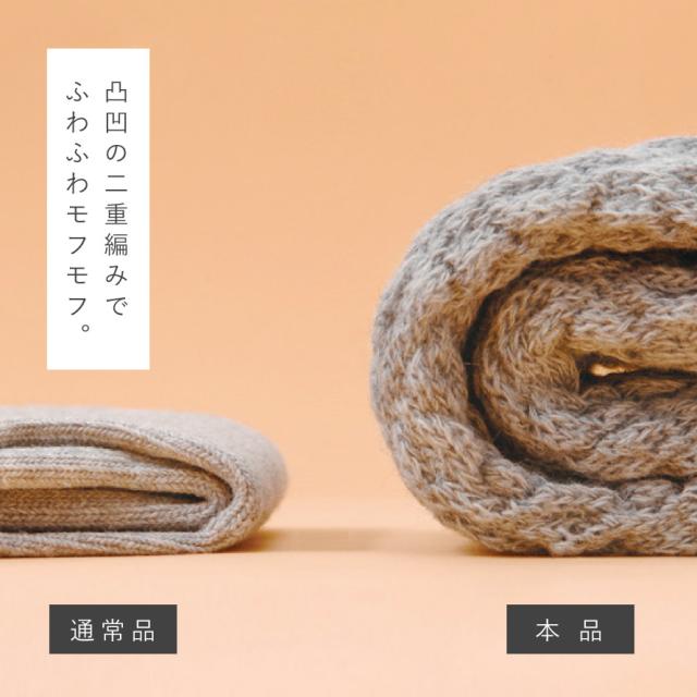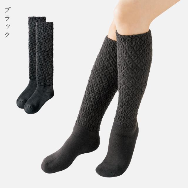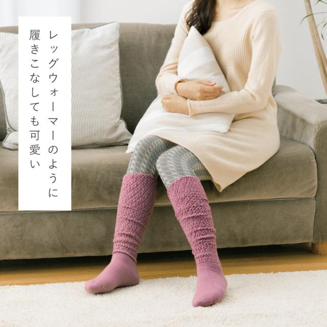 足首から太ももには凹凸の二重編みが施されふわふわ柔らか、さらに暖かい空気の層を作り血行不良の方にも。