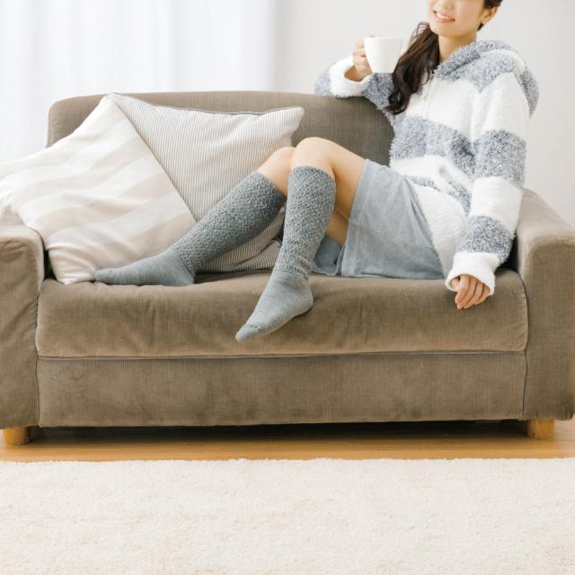 リラックスタイムはもちろんのこと、外出時にも使用できるので、防寒対策バッチリ。レッグウォーマーのように履きこなしても可愛い。
