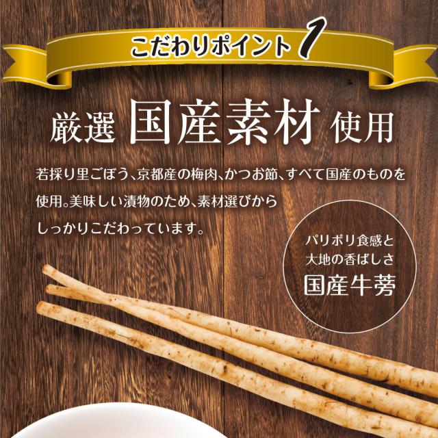 ごぼう(国産)、梅(国産)、漬け原材料[砂糖、ぶどう糖果糖液糖、醸造酢、かつお節、食塩]/酸味料