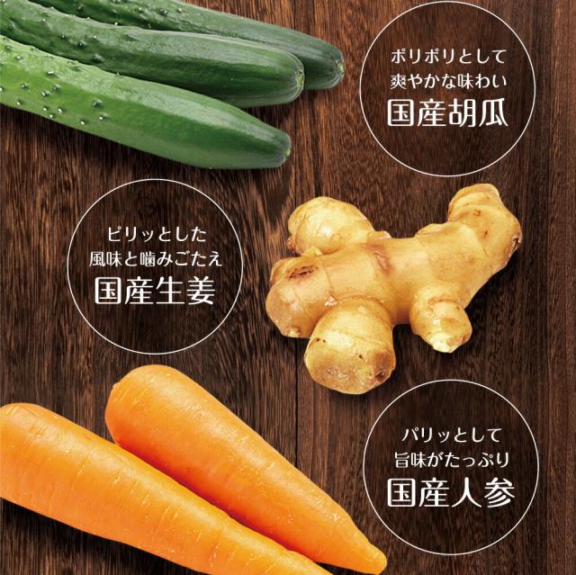 だいこん(国産)、きゅうり(国産)、しょうが(国産)、にんじん(国産)、漬け原材料[しょうゆ、砂糖、ぶどう糖果糖液糖、醸造酢、発酵調味液、とうがらし]/調味料(アミノ酸等)、カラメル色素、酸化防止剤(ビタミンC)、香料、(一部に小麦・大豆を含む)