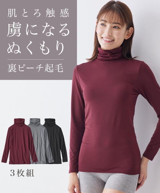 [keyword] 下着 ランジェリー インナー 大きいサイズ レディース 標準サイズ 普通サイズ ゆったりサイズ プラスサイズ あったか 冬 防寒 ストレッチ 伸び 裏起毛 素材 お買い得セット まとめ買い セット お得 [comment] 肌面を繊細に起毛。肌あたりやわらかであったか気持ちいい裏ピーチ起毛の長袖インナー。タートルネックだから首元の防寒もおまかせ。着回しの効く色揃えの3枚組です。