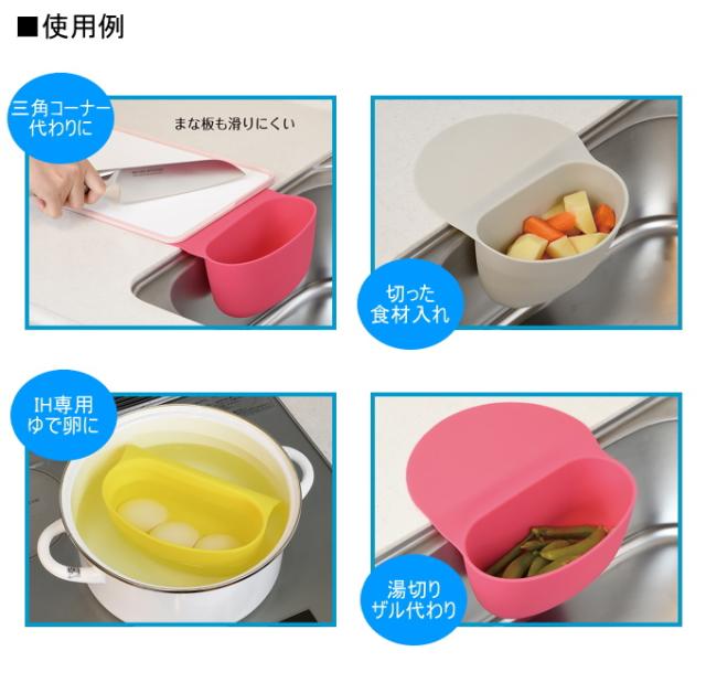 | 使用上の注意 | シンク内やテーブル面等での簡易的なゴミ受けや物入れ、調理器具として使用するものです。用途以外には使用しないでください。 シート部と密着させる面のほこりや汚れを取り除き、水分を軽く拭き取って使用してください。 貴重品や壊れやすいものを入れないでください。 密着させる面の条件によって異なりますが、落下するほどの重いものを入れないでください。 高い所や落下して危険な場所で使用しないでください。 鍋に入れて調理する場合は、IHクッキングヒーターを使用してください。 油切り等、熱した油には使用しないでください。 火のそばに置かないでください。耐熱温度以上の熱が加わりますと、溶けたり、変形する原因になります。 長時間、食材を入れたままにしないでください。 食器洗い乾燥機専用の洗剤に含まれている成分などの影響により、長時間洗浄された場合、表面に傷が付くことがあります。 使用初期は、シリコーン特有のにおいがすることがありますが、徐々に薄くなってきます。 |