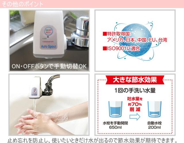 | 特徴 | お使いの蛇口に取り付けるだけで、自動水栓にすることができます。 赤外線センサーにより触れることがなく給水、止水ができるので衛生的にお使いいただけます。 無駄な給水をしないので節水効果にも期待ができます ボタン一つで手動切替にすることもできるので、水をためることも可能。 簡単取り付けだから、プラスドライバーと電池があればすぐに取り付けできます。 |